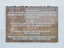 | Gedenktafel für im Jahr 1945 ermordete jüdische Zwangsarbeiter an der Pfarrkirche hl. Martin, Deutsch Schützen. | Eigenes Werk | Herzi Pinki | Datei:Plaque to victims of NS regime in Deutsch Schützen.jpg | |