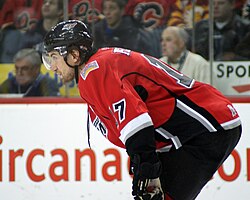 | Calgary Flames defenceman Matt Pelech during warmup prior to his 2nd career NHL game, in Calgary, against the Los Angeles Kings. | Eigenes Werk | Resolute | Datei:Matt Pelech 2009.JPG |