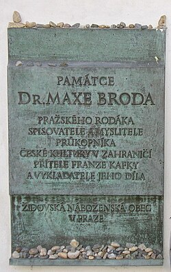 Gegenüber dem Grab von Franz Kafka (neuer jüdischer Friedhof, Prag ) steht eine Wand mit einer Gedenktaffel gewidmet an Max Brod (1884 - 1968), Freund, Biografer und Verleger des literarischen Werks von Franz Kafka. | Eigenes Werk | Ferran Cornellà | Datei:Bronze plaque commemorating Max Brod, Prague.JPG | |