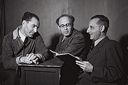 THE AUTHOR AND ARTISTIC DIRECTOR OF THE HABIMA THEATRE, DR. MAX BROD (RIGHT), WITH STAGE DIRECTORS TSHEMERINSKY AND ZVI FRIEDLAND (LEFT). | This is available from National Photo Collection of Israel, Photography dept. Government Press Office ( link ), under the digital ID D838-011 . This tag does not indicate the copyright status of the attached work. A normal copyright tag is still required. See Commons:Licensing for more information. | Zoltan Kluger | Datei:Flickr - Government Press Office (GPO) - DIRECTOR OF THE HABIMA THEATRE, DR. MAX BROD WITH STAGE DIRECTORS.jpg | |