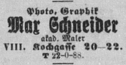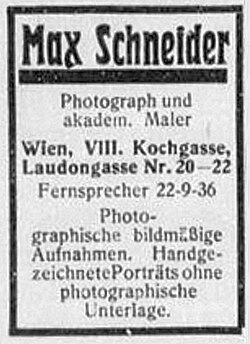- ↑ Letzter Eintrag für Schneider, – Max, Photograph, VIII. Kochgasse 20–22, Wohn. Nr. 32 In: Wiener Adreßbuch Lehmanns Wohnungsanzeiger Jg. 1938 Band 1, 1. Teil Namenverzeichnis S. 1150