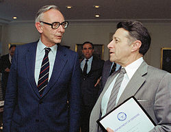| Secretary of Defense Caspar W. Weinberger meets with Foreign Minister Van der Stoel of the Netherlands in the Pentagon, Room 3E912. | DefenseImagery.mil | Frank Hall | Datei:Secretary of Defense Caspar Weinberger meets with Foreign Minister Van der Stoel of the Netherlands in the Pentagon 1983.jpg |