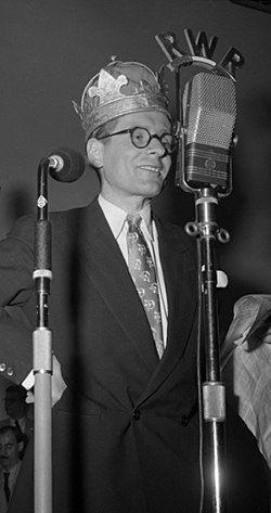 | Maxi Böhm als Conférencier der Radiosendung Schach dem König im Wiener Schwechater Hof (Übertragung von Radio Rot-Weiß-Rot ) | Diese Datei ist ein Ausschnitt aus einer anderen Datei | Fotografie: Fotograf im Auftrag der United States Information Agency (Pictorial Section der Information Services Branch (ISB)). Ausschnitt: Christoph Waghubinger ( Lewenstein ) | Datei:USIS - Maxi Boehm 1 II.jpg |