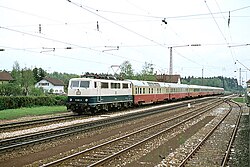 | TEE 84 "Mediolanum" (Milano - München) mit Lokomotive DB 111 065-9 und Wagen FS TEE in Großkarolinenfeld, 1977-05-07 | http://www.bundesbahnzeit.de/ | Ulrich Budde | Datei:111+TEE Mediolanum.jpg | |