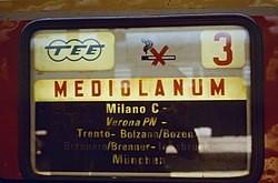 | Sign in the side of a car (carriage) of the northbound TEE Mediolanum , while at Bolzano station, in 1982 | Eigenes Werk | Merle Morgan (of Portland, Oregon, USA) | Datei:TEE Mediolanum - sign in the side of train car, 1982.jpg | |