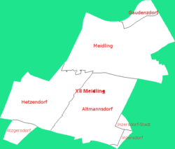 Meidling bildet eine der 89 Wiener Katastralgemeinden und erstreckt sich über eine Fläche von 318,61 Hektar.[1] Der Bezirksteil liegt im Norden des Gemeindebezirks am Wienfluss zwischen Schloss Schönbrunn und Gürtel. Das historische Zentrum des früheren Straßendorfs befindet sich an der Meidlinger Hauptstraße zwischen Lobkowitzbrücke und Tivoligasse. Die südliche Grenze Meidlings zu den Bezirksteilen Altmannsdorf und Hetzendorf wird unter anderem von der Wienerbergstraße, der Edelsinnstraße und dem Schwetzweg gebildet.