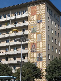 | August-Fürst-Hof (1955-57) mit Majolikabildern der historischen Wappen Meidlings, Meidlinger Hauptstraße 8-10, Wien-Meidling | Eigenes Werk | Buchhändler | Datei:Meidlinger Hauptstraße 05.JPG | |