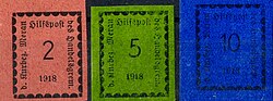 Philatelie-Experten gehen davon aus, dass Sammler in den Postämtern auch Blankoumschläge mit Hilfspost-Marken abstempeln ließen. Auch dürften größere Mengen an Souvenirkuverts produziert und auch noch nach Mitte Dezember 1918 mit rückdatierten Poststempeln entwertet worden sein.[17]