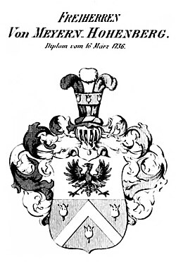 - 10. Januar 1854 Sachsen-Coburg-Gothaische Anerkennung des Freiherrnstands und der Namensform von Meyern-Hohenberg für die Brüder Friedrich, auf Hohenberg, königlich großbritannischer Kapitän, Gustav, herzoglich sachsen-coburg-gothaischen Kabinettsrat, und Leopold Meyern von Hohenberg, K.K. Hauptmann