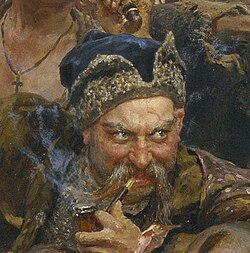 | Detail from Reply of the Zaporozhian Cossacks , Cossack No. 10. | Diese Datei ist ein Ausschnitt aus einer anderen Datei | derivative work: uk:User:Kamelot | Datei:Zaporoj kazaki-8.jpg |