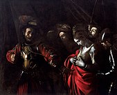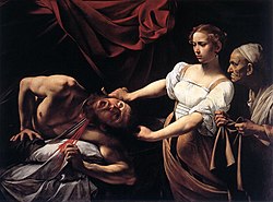 Auftraggeber für das Gemälde Judith und Holofernes (1598/99, Galleria Nazionale d’Arte Antica Palazzo Barberini, Rom) war der während Caravaggios Aufenthalts im Palast des Monsignor Fantino Petrignani benachbarte Maffeo Barberini (der spätere Papst Urban VIII.), der zu dieser Zeit als Kammerkleriker für die päpstlichen Finanzen zuständig war. In ihm stellt Caravaggio erstmals den Tathergang der Enthauptung des assyrischen Heerführers durch die schöne jüdische Witwe Judith dar. Als Kontrast setzt Caravaggio neben die zugleich entschlossen und angewidert Handelnde das Gesicht einer alten Magd, die bereitsteht, den Kopf des Holofernes entgegenzunehmen. Als Modell für die Judith stand die Dirne Fillide Melandroni, ein von Caravaggio auch für andere biblische Frauengestalten (Martha, Katharina) bevorzugtes Modell.[114]