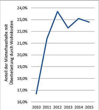 In den Vorjahren hatte die Überbelastung durch Wohnkosten in Mieterhaushalten aufgrund steigender Mieten und Energiekosten zugenommen.[65]