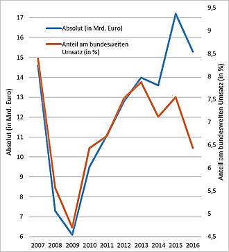 In Berlin entwickelten sich von 2007 bis 2013 der durch Immobiliengeschäfte erzielte Umsatz in absolute Zahlen und dessen Anteil am bundesweiten Umsatz parallel zueinander. Im ersten Jahr nachdem Berlin die Möglichkeiten aus dem Mietrechtsänderungsgesetz anwandte,[66] änderte sich dies: Während der absolute Umsatz wie in den Vorjahren bis 2015 weiter anstieg, sank der Anteil am bundesweiten Umsatz. Ab 2015, als die Mietpreisbremse eingeführt wurde, sank auch der absolute Umsatz.[91]