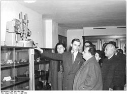 | Es folgt die historische Originalbeschreibung , die das Bundesarchiv aus dokumentarischen Gründen übernommen hat. Diese kann allerdings fehlerhaft, tendenziös, überholt oder politisch extrem sein. Zentralbild-Junge Hlg-Wi 5.4.1954 IV. Parteitag der sozialistischen Einheitspartei Deutschlands,Berlin, Werner-Seelenbinder-Halle Am 5.4.1954 besuchten die ungarischen Genossen, die als Gäste auf den IV.Parteitag der sozialistischen Eiheitspartei Deutschlands weilen, den VEB Drehmaschinenwerk "7. Oktober". UBz Im technischen Kabinett des VEB "7.Oktober" zeigt der Stellvertreter des Sekretärs der Betriebsparteiorganisation Heinz Dietrich dem Mitglied des Politbüros und Sekretär des Zentralkomitees der Partei der ungarischen Werktätigen Mihály Farkas (Mitte), das Modell einer Vertikaldrehbank.(rechts) Sándor Rónai, Mitglied des Zentralkomitees und Präsident der Nationalversammlung Ungarn 5.4.1954 | Dieses Bild wurde im Rahmen einer Kooperation zwischen dem deutschen Bundesarchiv und Wikimedia Deutschland aus dem deutschen Bundesarchiv für Wikimedia Commons zur Verfügung gestellt. Das deutsche Bundesarchiv gewährleistet eine authentische Bildüberlieferung nur durch die Originale (Negative und/oder Positive), bzw. die Digitalisate der Originale im Rahmen des Digitalen Bildarchivs . | Peter Heinz Junge | Datei:Bundesarchiv Bild 183-24000-0402, VEB Großdrehmaschinenwerk "7.Oktober", ungarischer Besuch.jpg | |