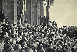 | Premier Károlyi addressing the crowds from the Parliament stairs, just after the formation of the new revolutionary government, Budapest , 16 November 1918. Károlyi under the X in the picture. | https://archive.org/details/outlawsdiary00tormuoft (pp. 60); Possible copyright status: NOT_IN_COPYRIGHT | Tormay, Cecile | Datei:Karolyi-discurso--outlawsdiary00tormuoft.jpg | |