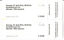| Eintrittskarten zu einem Kabarett von Mike Supancic am 23. April 2016 in Mürzzuschlag | Eigenes Werk | SK Sturm Fan | Datei:Tickets Mike Supancic 23. April 2016 Mürzzuschlag.jpg |