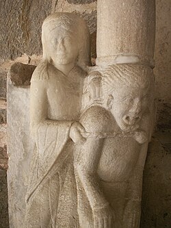| Romanische Skulptur aus der zweiten Hälfte des 12. Jahrhunderts im Kreuzgang des Stifts Millstatt / Kärnten / Österreich . Diese Plastik steht links des südlichen Kirchenportals, der Mönchspforte zum Kreuzgang. Die männliche Figur mit herausgestreckter Zunge, interpretiert als das Heidentum oder Dämon , trägt auf seinem Rücken eine der Wand vorgelegte Säule. Eine Frau, die Kirche , bändigt ihn mit einer Kette. Eine ähnliche Darstellung findet sich am Ost-Chor des Doms in Worms . | taken and uploaded by joadl | joadl | Datei:Millstatt Kreuzgang Detail 06 2006.JPG | |