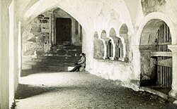 | Nordöstlicher Teil des Kreuzgangs im Stift Millstatt in Millstatt / Kärnten / Österreich . Das Foto zeigt den Kreuzgang noch in vortouristischer Zeit. Die Viererarkade rechts und der Ausgang zum Hof, der in den heute nicht mehr vorhandenen Kapitelsaal führte, sind noch mit Holz verblankt. Der Boden weist noch keinen Belag auf. Im Hintergrund eine unbekannter Mann, möglicherweise der Fotograf. Originalgröße des Bildes: 58 X 93 mm. Bildaufdruck: Kärnten. No. 754. Nördl. Ecke d. rom. Kreuzgang, Millstatt. ⇒ Aufnahmen aus derselben Kameraposition im Winter 2009 | vmtl. K.u.K. Hoffotograf Alois Beer (1840-1916), Klagenfurt | scan and upload by Joadl | Datei:Millstatt Kreuzgang Nordostecke um 1890.jpg | |