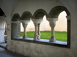 | Innenansicht der südlichen Viererarkade im Ostflügel des romanischen Kreuzgangs im Stift Millstatt in Millstatt / Kärnten / Österreich . Dort wo heute der grüne Rasen zu sehen ist, befand sich früher der Kapitelsaal des Benedektinerklosters. | Eigenes Werk | Joadl | Datei:Stift Millstatt Kreuzgang Viererarkade Nord 01.JPG |