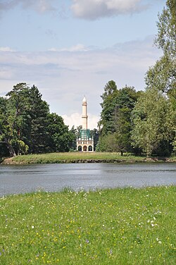 Das Gebäude ist streng symmetrisch angelegt. Das Erdgeschoss des Gebäudes steht auf viereckigem Grundriss, den ein Arkadenumgang umschließt. Ebenfalls nach dem viereckeigen Grundriss richtet sich der erste Stock aus. Erst daraus ragt mittig das Minarett mehr als 60 Meter in die Höhe. Der Turm ist in vier Segmente geteilt: Die beiden unteren haben einen achteckigen Querschnitt, die darüber folgenden einen zylindrischen. Die Segmente sind durch umlaufende Balkone voneinander getrennt. Gekrönt wird das Minarett durch eine Kuppel und die Mondsichel. 302 Stufen führen auf den oberen, dritten Balkon des Turms. Über dem Gesims der beiden unteren Stockwerke erheben sich 12 Türmchen und vier Kuppeln. Ursprünglich umgab den Turm noch eine Terrasse mit vier Eckpavillons. Diese wurden im Zuge der Umgestaltung des Parks in einen englischen Landschaftspark 1810 abgerissen. Das Gebäude ist ausgemalt und mit moralisierenden Inschriften in arabischer Schrift versehen. Gleiches gilt für die acht Säle, die – neben dem Treppenhaus – den ersten Stock einnehmen.[4]