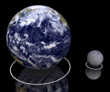 | Größenvergleich zwischen Erde (ø = 12.756 km) und Mond (ø = 3476 km) (Fotomontage mit maßstabsgerechten Größen; der mittlere Abstand beträgt jedoch 30 Erddurchmesser) |
