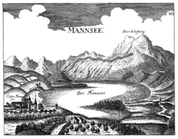 | Ansicht des Mondsees (damals Mannsee). Links am Rand ist das Kloster Mondsee zu sehen und rechts der Schafberg . Kupferstich von Georg Matthäus Vischer | Scan aus: Georg Matthäus Vischer – Topographia Austriae superioris modernae , Tafel 105 (1674) Wien: Archiv Verlag 2005 (Reprint) | Georg Matthäus Vischer | Datei:Mannsee.png |