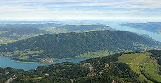 | Blick vom Schafberg auf den Höhenzug „ Hochplett “ bzw. in Richtung Norden mit links im Vordergrund dem Mondsee und rechts im Hintergrund dem Attersee . Die höchste Erhebung des Höhenzuges ist die Hochplettspitze mit 1134 m. Der südliche und östliche Teil des Höhenzuges befindet sich auf dem Gemeindegebiet von Unterach am Attersee , der westliche auf dem Gemeindegebiet von Innerschwand am Mondsee und der nördliche auf dem Gemeindegebiet von Oberwang . | Eigenes Werk | C.Stadler/Bwag | Datei:Höhenzug „Hochplett“.JPG | |