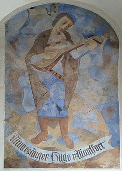 | Dieses Fresko stellt den Minnesänger Hugo von Montfort da, es befindet sich am Tabor in Frohnleiten. | Selbst fotografiert | Clfaster | Datei:Hugo von Montfort - Fresko.JPG |