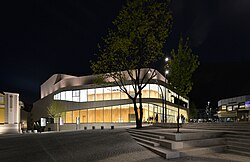 | Das Kultur Kongresszentrum Montforthaus 1 in Feldkirch wurde nach Plänen von Hascher Jehle Architektur 2014 fertiggestellt und am 2. Januar 2015 feierlich eröffnet. | Eigenes Werk | Feel free to use my photos, but please mention me as the author and if you want send me a message . or ( rufre@lenz-nenning.at ) | Datei:Montforthaus, 20h45.JPG | |