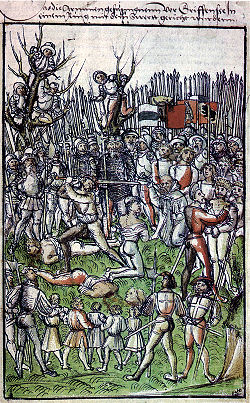 ![]() Belagerung – Hinrichtung – Gedenkkapelle. Aus der «Zürcher Chronik» 1485/86 von Gerold Edlibach |