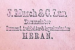 - ↑ Carl Lun (1853–1925): Geboren in Bozen, Gymnasium in Brixen, Matura in Feldkirch. Ab 1872 Studium am Polytechnikum München, ab 1877 an der Technischen Hochschule Wien. Studienabschluss als Ingenieur. Erste berufliche Praxis in Bozen (1878–1880) bei der Bezirkshauptmannschaft, um die Stelle eines Staatsingenieurs zu erlangen. 1880 Übersiedlung nach Meran, um gemeinsam mit Josef Musch das Bureau für Architektur & Ingenieurbau Musch & Lun zu gründen. 1892 bis 1896 politische Tätigkeit im Gemeindeausschuss von Meran, 1896 bis 1908 im Gemeinderat. 1902 bis 1913 gehörte Carl Lun dem Gewerbeausschuss der Handels- und Gewerbekammer in Bozen an. Viele weitere Ämter, z. B. als Mitglied des Verwaltungsrates der Etschwerke in Bozen und im Verein für Alpenhotels. Vgl.: Albert Mascotti: Josef Musch & Carl Lun. In: turrisbabel. Nr. 5, Bozen 1986, S. 28–34.