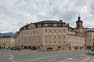 | Diese Datei zeigt das im Tiroler Kunstkataster erwähnte Objekt mit der ID 118270 . ( auf tirisMaps , PDF , weitere Bilder auf Commons , Wikidata ) | Eigenes Werk | Simon Legner ( User:simon04 ) | Datei:Ehemaliges Ursulinenkloster Innsbruck (IMG 0790).jpg | |