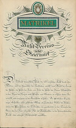 | Die 1821 angelegte Matrikel des Steiermärkischen Musikvereins | Eigenes Werk | Susanne Flesch | Datei:Matrikel des Musikvereins für Steiermark (1821).jpg | |