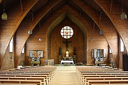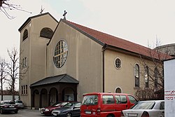 Der breitgelagerte Bau mit Giebeldach und Turm wurde im Jahre 1948 nach den Plänen des Architekten Walter Reisch erbaut und wurde 1948 geweiht und im Jahre 1950 zur Pfarrkirche erhoben. Das Kirchengebäude fällt durch seinen ländlichen Charakter mit ganzflächiger Holzverschalung des Saalraumes und einem hölzernen Vorbau auf. Die Glasfenster mit Szenen aus dem Leben Marien und das Chorwandfenster Gottvater sind von Lucia Jirgal. Über einer Holzmensa ist eine Retabelwand mit Evangelistenreliefs und eine Kreuzigungsgruppe von Gret Einberger aus 1950, wie auch der Retabelaltar mit Schnitzereien in der Kapelle, welche sich im Turmuntergeschoß befindet. Die Orgel baute Dreher und Reinisch (1950).
