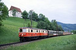 | Wallfahrer-Sonderzug der Mariazellerbahn bei Kirchberg an der Pielach , Niederösterreich. Der talauswärts fahrende Zug in Richtung St. Pölten passiert die Andreaskirche. | own image, scan from slide | Herbert Ortner , Vienna, Austria | Datei:Mariazellerbahn 01.jpg | |