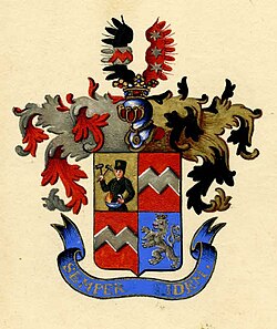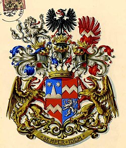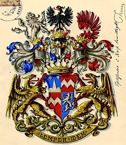 1882/1898: Schild quadriert. 1. In Blau ein silberner Dreiberg mit erhöhter Mittelkuppe, oben begleitet von zwei silbernen Sternen. 2. Und 3. In Rot ein silberner Zickzackbalken. 4. In Blau ein zweischwänziger silberner Löwe. Auf dem Schild ruht die Freiherrnkrone. Darüber erheben sich drei gekrönte Helme. Auf dem rechten steigt der Löwe von 4. Wachsend mit blau-silbernen Decken, auf dem mittleren mit rechts blau-silbernen, links rot-silbernen Decken ein rotbewehrter schwarzer Adler und auf dem linken ein mit dem Balken aus dem Schild belegter roter Flügel mit rot-silbernen Decken.[2]