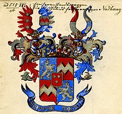 | Wappen derer von Nadherny (Edler von; 1838) | Österreichisches Staatsarchiv, https://www.archivinformationssystem.at/detail.aspx?ID=4319007 AT-OeStA/AVA Adel HAA AR 637.15 Nadherny, Johann, Gutsbesitzer in Böhmen, Adelsstand, „Edler von“, 1838.09.30. | Unbekannt (1838) | Datei:AT-OeStA AVA Adel HAA AR 637.15.jpg | |