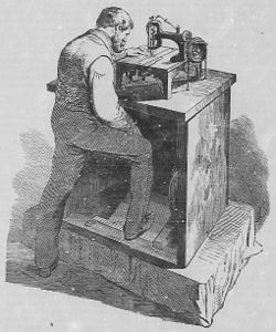 Im Jahre 1846 baute wiederum ein Amerikaner namens Elias Howe eine nach dem gleichen Prinzip arbeitende Nähmaschine. Diese Maschine leistete die Näharbeit von vier bis sechs Handnäherinnen. Gerechterweise muss man Elias Howe als den Erfinder der Doppelsteppstich-Nähmaschine bezeichnen. Man geht auch bis zur heutigen Zeit davon aus, dass Howe die eigentliche Entwicklung der Nähmaschine zu verdanken ist. Es war in Boston um 1839, als der verarmte Mechaniker Elias Howe, der Schwierigkeiten hatte, seine Frau und die drei Kinder zu ernähren, seinen Chef zu einer Kundin sagen hörte: „Wer da jemals eine Maschine erfände, die nähen kann, der machte ein Vermögen!“ Diese Idee ließ Howe nicht mehr los. Er beobachtete die Finger seiner Frau und versuchte zuerst, deren Handbewegungen maschinell umzusetzen. Der erste Versuch schlug fehl, aber er ließ sich nicht entmutigen. Er tüftelte so lange herum, bis er eine Nähmaschine gebaut hatte, die 250 feste Stiche in der Minute nähte. Bei einem Wettbewerb gegen geübte Handnäherinnen nähten die Näherinnen 50 Stiche pro Minute, seine Maschine jedoch 300. Howe ließ seine Maschine am 10. September 1846 in Amerika auf seinen Namen patentieren.[8] Aus Mangel an Geld verkaufte er sie mit Patentversprechen an seinen Bruder, der mit der Maschine nach London reiste und sie dort für 250 Pfund an William Thomas verkaufte. Am 1. Dezember 1846 wurde die Maschine auf den Namen W. Thomas in London patentiert. Dennoch fand Howe niemanden, der sie kaufen und in größeren Stückzahlen produzieren wollte. Er führte seine Maschine zwei Herstellern vor. Diese schreckten vor dem Preis von 300 US-Dollar zurück und fürchteten auch die Drohungen der Schneidergilde. Da er in Amerika nichts erreichen konnte, reiste Howe mit seiner Familie nach England, da er sich dort bessere Chancen ausrechnete.