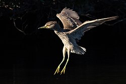 | Juvenile black-crowned night heron ( Nycticorax nycticorax ) in flight at Las Gallinas Wildlife Ponds, Marin County, California. | Eigenes Werk | Frank Schulenburg | Datei:Black-crowned night heron in flight.jpg | |