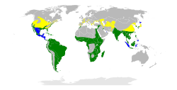 | Distribution map of Black-crowned Night Heron . Yellow: breeding, green: year-round, blue: nonbreeding. Adapted from: Kushlan, James A. and James A. Hancock, Herons , Oxford ; New York : Oxford University Press, 2005. ( ISBN 9780198549819 ) (OCLC 54913407) | Eigenes Werk | Cephas | Datei:Nycticorax nycticorax map.svg | |