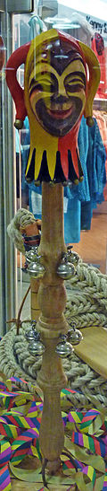 | Marotte (Narrenszepter) - Häsrequisit oder Narrenutensil der Zähringer Burgnarren Freiburg i. Br. e.V. Exponat aus der Sammlung Peter Scharte aus der Ortenau, vom 14. Januar bis 13. Februar 2013 im Einkaufszentrum Schwarzwald City (Freiburg) unter dem Titel „Narrenrequisiten - vielfältig und kreativ“ ausgestellt. | Eigenes Werk | artwork: Johann Pfunner photo: James Steakley | Datei:Marotte - Burgnarren - Freiburg-Zähringen.jpg | |