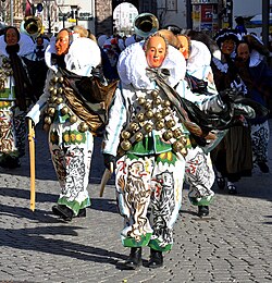 | Fasnet in Villingen, Fasnetsmontag 2011 Narren der Narrozunft beim Maschgerelauf, Figur: „Wuescht“ | Eigenes Werk (own photograph) | Photo: Andreas Praefcke | Datei:Villingen Fasnet2011 09.jpg | |