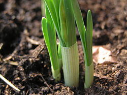 Auf dem Zwiebelboden entwickelt sich der Blütenstängel, auf dem in einem knospigen Zustand die Blütenanlage des folgenden Frühjahrs vorhanden ist. Darum herum befinden sich jeweils zwei bis drei Laub- und Scheidenblätter. Der Blütenstängel und die Blütenanlage des übernächsten Jahres befinden sich in der Achsel des zweiten Laubblattes.