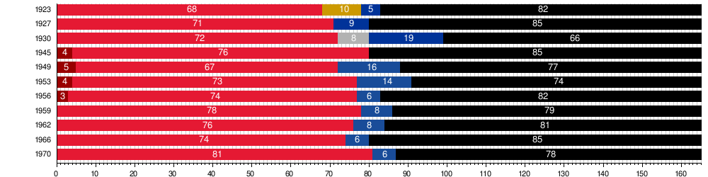 Ab 1945 hatte der Nationalrat zunächst 165 Abgeordnete, erst 1971 wurde die Anzahl der Abgeordneten wieder auf 183 erhöht. Dies war die Gegenleistung der SPÖ an die FPÖ für die Stützung der SPÖ-Minderheitsregierung. Vorrangiger Wunsch der Freiheitlichen war, mit ihren damals 5,5 Prozent wieder Klubstärke, die damals bei acht Abgeordneten lag, zu erreichen.[2]