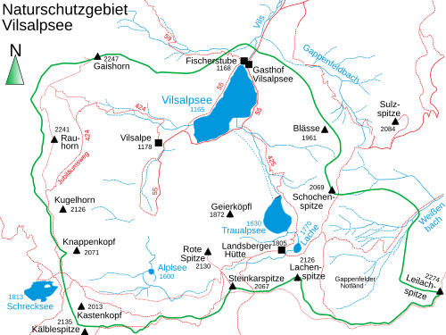 | Karte des Naturschutzgebiets "Vilsalpsee" im Tannheimer Tal (Tirol, Österreich). Grün: Grenze Naturschutzgebiet Rot: Wanderwege Blau: Gewässer Quadrat: Gasthof/ Hütte/ Alm Dreieck: Gipfel | Eigenes Werk | Kauk0r | Datei:Naturschutzgebiet Vilsalpsee.svg | |