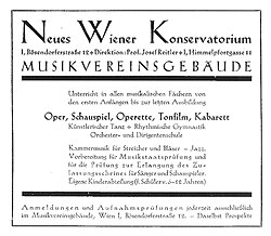 | advertisement for Neues Wiener Konservatorium, Vienna | Anbruch. Österreichische Zeitschrift für Musik. Vorwärts-Verlag, Wien 1934, Heft 5 | unknown; scan: Walter Anton | Datei:Neues Wiener Konservatorium Inserat 1935.jpg |