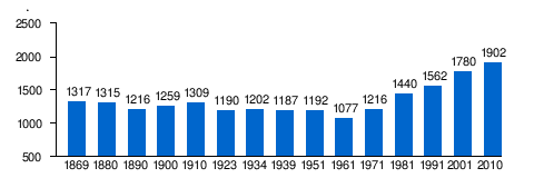 Seit einem Tiefstand von 1077 Einwohnern im Jahr 1961 steigt die Bevölkerungszahl konstant.[2]
