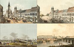 | Vier Blätter aus den Wien-Ansichten des Verlags Artaria dokumentieren den Abriss der Nikolaikirche an der Stelle des heutigen Rochusmarktes in Wien-Landstraße im Jahr 1784: Links oben: Die Pfarrkirche und Gottesacker auf der Landstraße . 1. Etat 1783: Die Nikolaikirche steht prominent links im Bild. Rechts oben: Die Augustiner Pfarrkirche . 2. Etat dieser Ansicht, um 1805. An Stelle der abgerissenen Nikolaikirche ist eine leere Straße mit einigen Alleebäumen zu sehen. Links unten: Ansicht gegen die Landstraße . 1780. Das Invalidenhaus in der Bildmitte ist noch nicht fertiggestellt, rechts sind die Kirchtürme von Elisabethinenkirche , Nikolaikirche und Rochuskirche zu erkennen. Rechts unten: Ansicht des neuen Invaliden-Hauses am anfang der Landstraße. 1. Etat 1792: Das Invalidenhaus ist fertiggestellt, der Kirchturm der Nikolaikirche ist verschwunden. | R. Witzmann und S. Békési, Schöne Aussichten, ISBN 978-3850330985 . | Laurenz Janscha, Johann Ziegler. Scan und Collage von Feldkurat Katz. | Datei:Dokumentation Abriss der Nikolaikirche in Wien-Landstraße 1784.jpg | |
