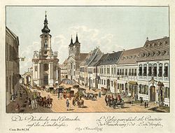 | Ansicht der 1784 abgerissenen Nikolaikirche an der Stelle des heutigen Rochusmarktes in Wien-Landstraße : Blatt aus den Wien-Ansichten des Verlags Artaria von Johann Ziegler mit der Bezeichnung Die Pfarrkirche und Gottesacker auf der Landstraße. | R. Witzmann und S. Békési, Schöne Aussichten, ISBN 978-3850330985 . | Johann Ziegler | Datei:Nikolaikirche Wien 1783.jpg | |