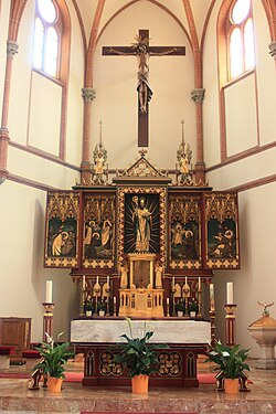 Der Hauptaltar und die beiden Seitenaltäre wurden 1896 von Clemens Raffeiner nach Entwürfen von Pater Johann Maria Reiter gefertigt.